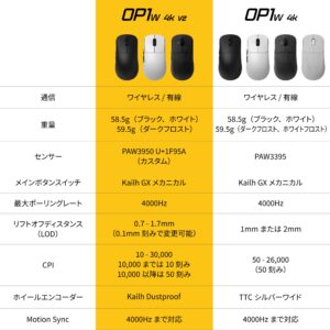 ワイヤレス・4000Hzポーリングレート対応のゲーミングマウス「OP1w 4K」のセカンドバージョン。最大4000Hz対応のUSBドングルを標準装備。335 mAhのバッテリーを搭載し、30時間の連続動作が可能。メインボタンのスイッチを簡単に変更できるホットスワップ機構に対応し、様々な交換スイッチ(オプション品)にカスタムできる。カラーは3色展開。