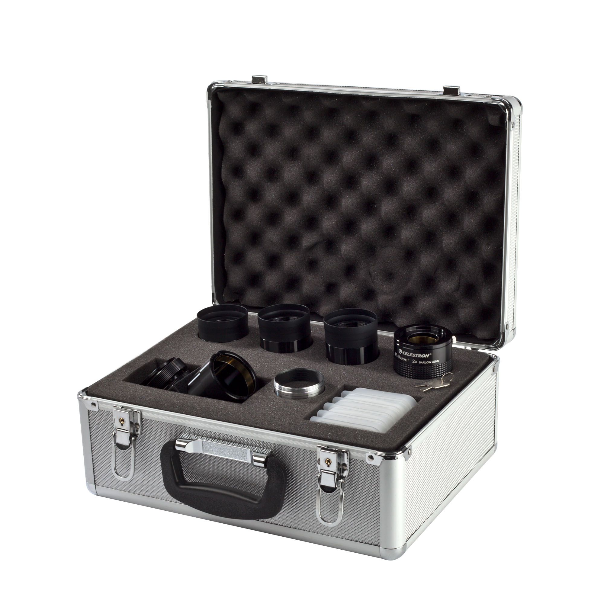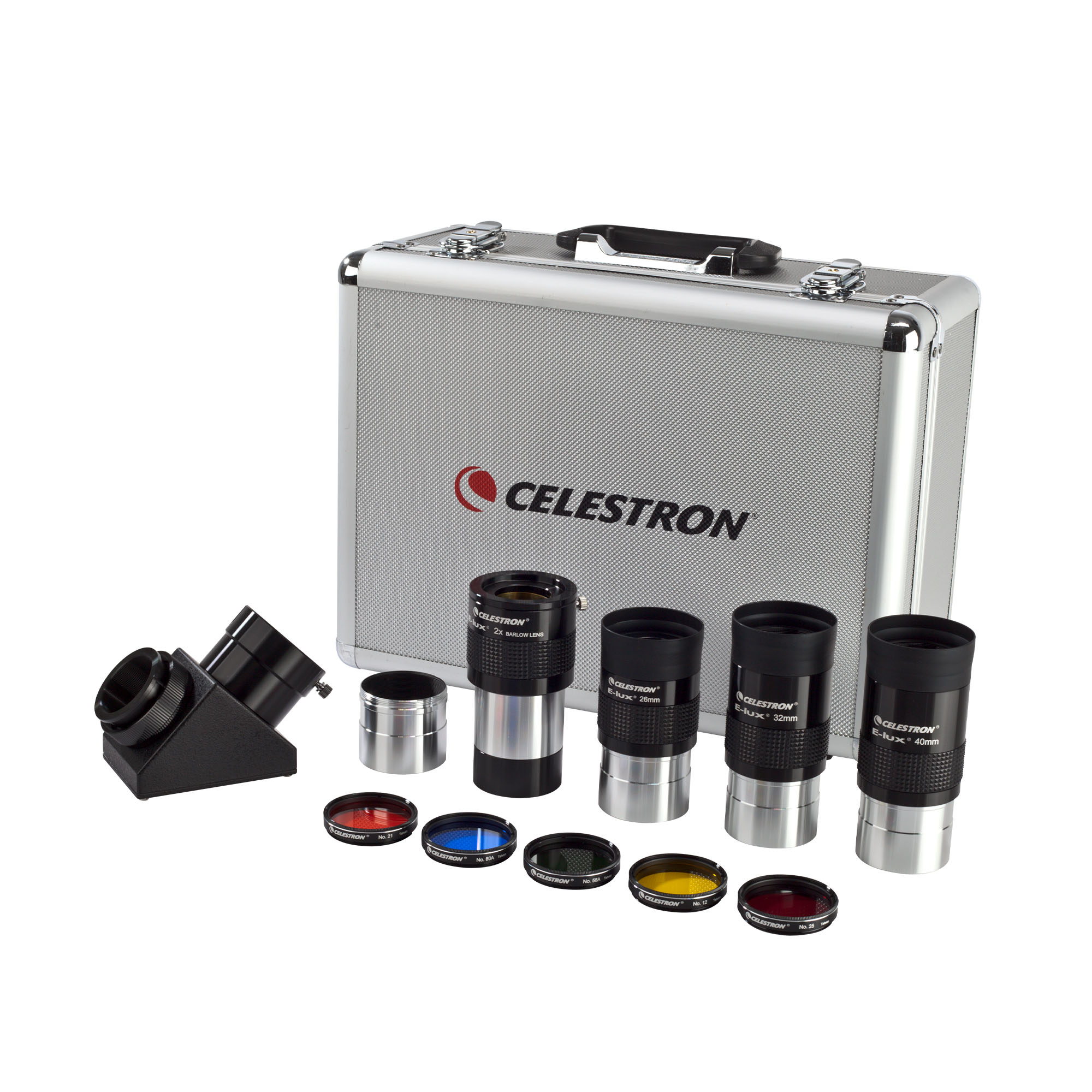 シュミットカセグレンや屈折望遠鏡で2インチ規格の広視野観測を行うためのアクセサリー一式です。3種類のE-lux接眼レンズ(26/32/40mm)と2倍バローレンズにより、計6通りの倍率運用が可能。90度ミラーダイアゴナル、屈折望遠鏡用アダプター、5色の惑星用フィルター、フォーム入り金属製ケースを同梱。全レンズにフルマルチコートを施し、光透過率を高めた高品質な視界を提供します。