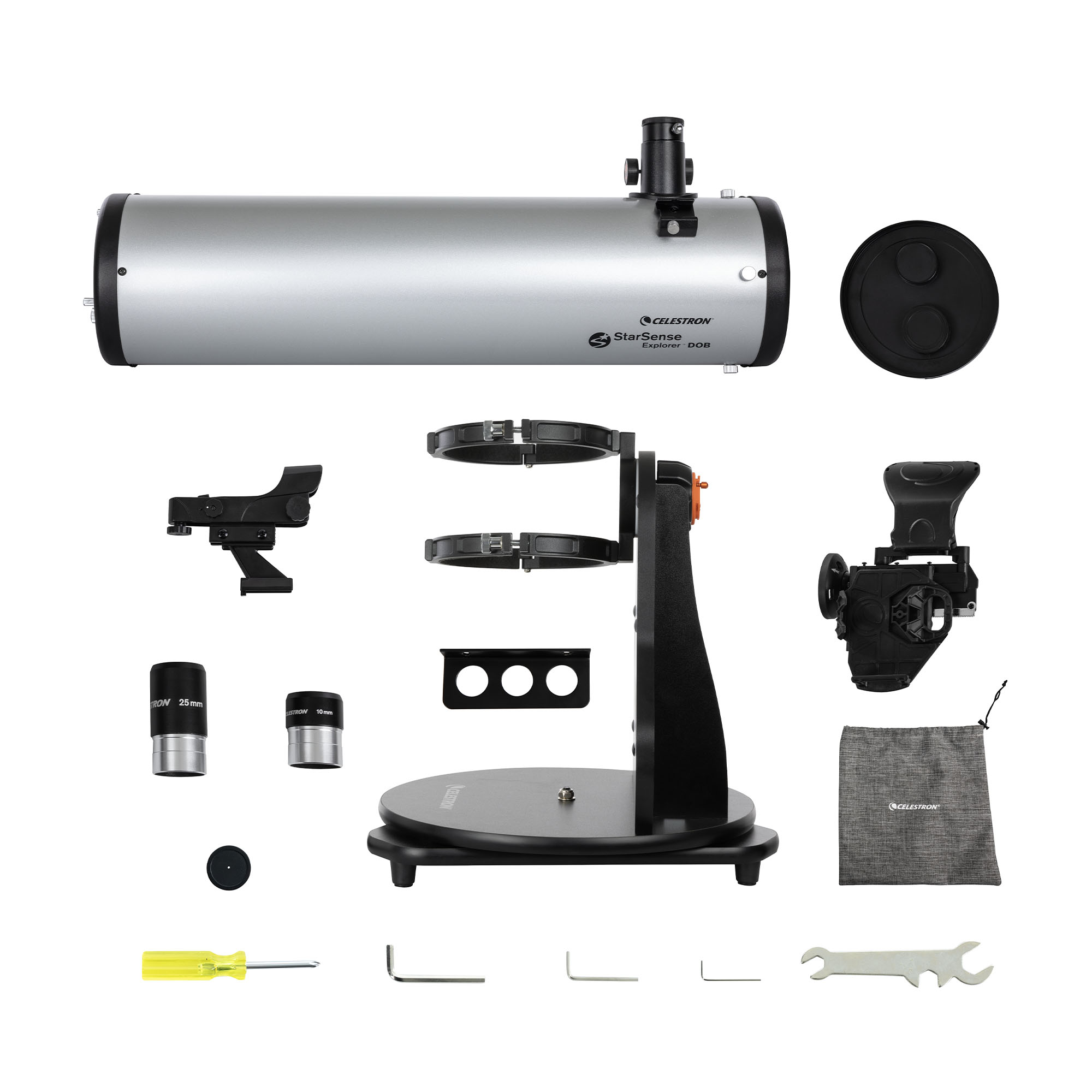 25mmおよび10mmのケルナー接眼レンズ、StarSenseドック、StarPointerファインダー、接眼レンズラック、コリメーションキャップを同梱。