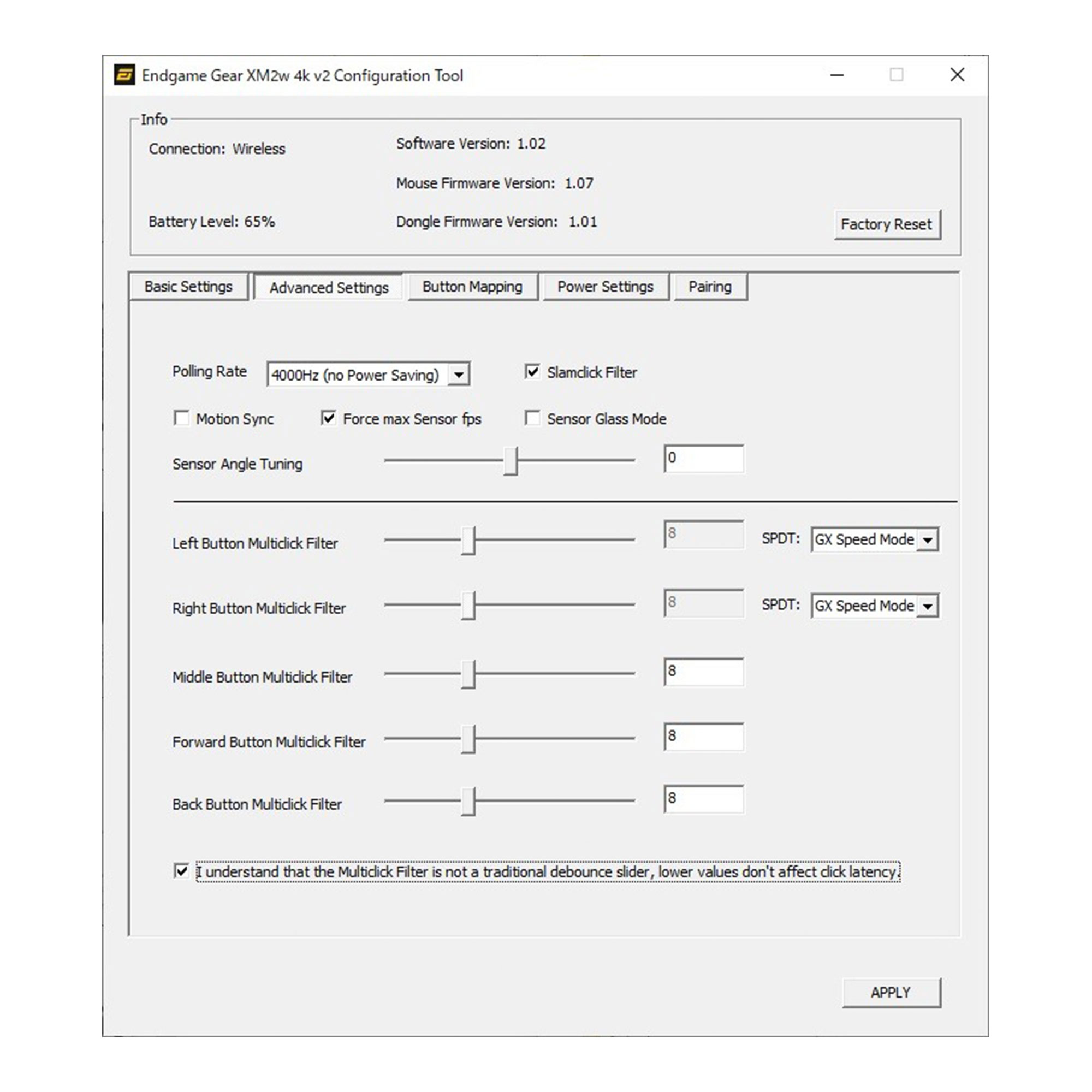 メインボタンのモード変更や最大スキャンレートのON/OFF、LOD設定、ボタンのリマップ、バッテリー節電の調整などを行えるソフトウェアを用意。メーカー公式サイトからダウンロードして使用できる。