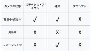 9.カメラの録画中、保存中、更新中、フォーマット中にレンズガードを取り付けた場合、カメラに下表のようなプロンプトが表示されます。
