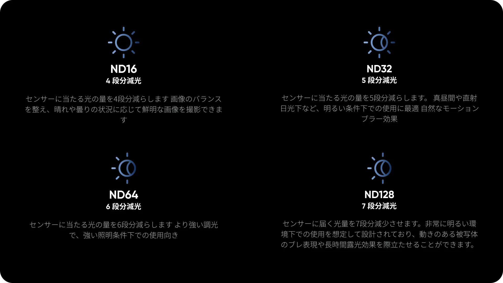 | 使用方法 | ![]() 1.NDフィルターをレンズに取り付け、時計回りに回して固定します。 2.NDフィルターが正しく装着されると、カメラに通知が表示されます。正確に画像補正するため、NDフィルターモデルを正しく選択します。 |